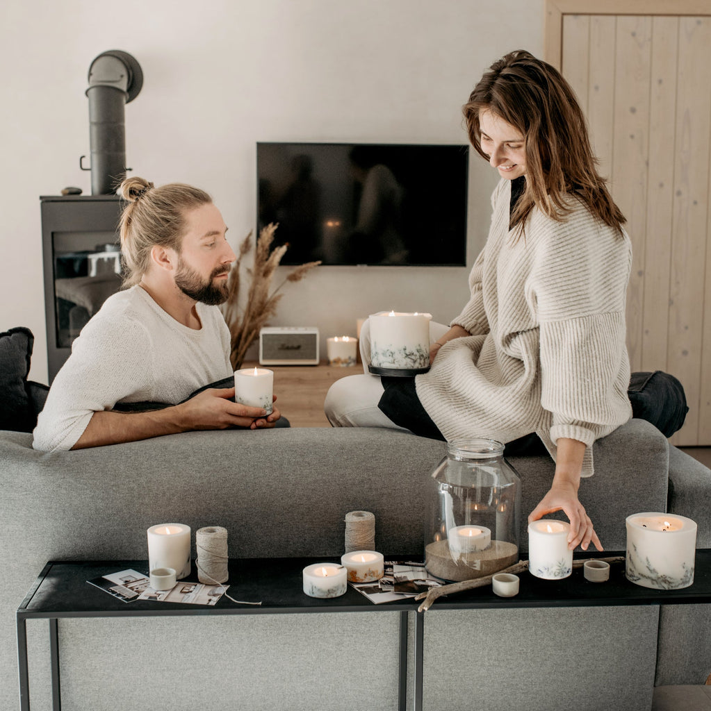 Hand-poured from a blend of soy and rapeseed wax, this botanical pillar candle is infused with a natural juniper fragrance and decorated with juniper twigs and limonium flowers. As it burns in a tunnel, the soft glow illuminates the herbs within, creating a stunning, nature-inspired centerpiece and a warm, uplifting atmosphere.