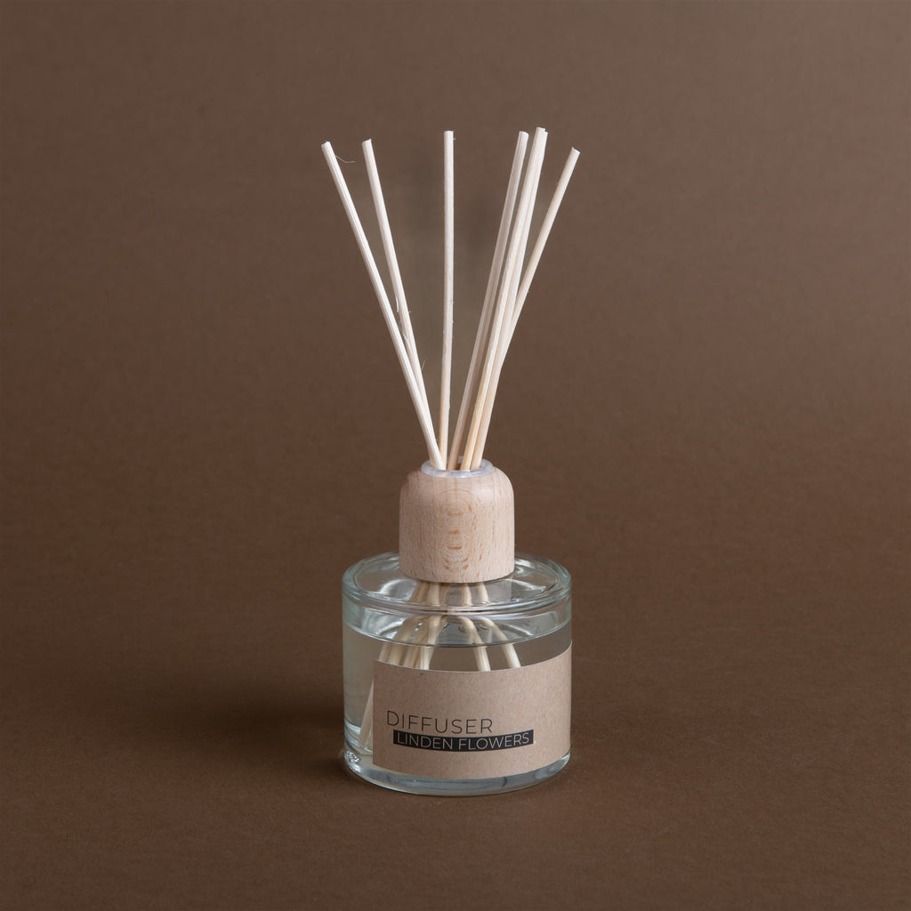 This elegant diffuser features a delicate linden flowers fragrance blended with a glycerin-derived diffuser base, poured in a minimalist glass bottle with a wooden lid. Seven natural rattan sticks gently diffuse the uplifting floral aroma into the air, creating a fresh, long-lasting atmosphere that feels close to nature.