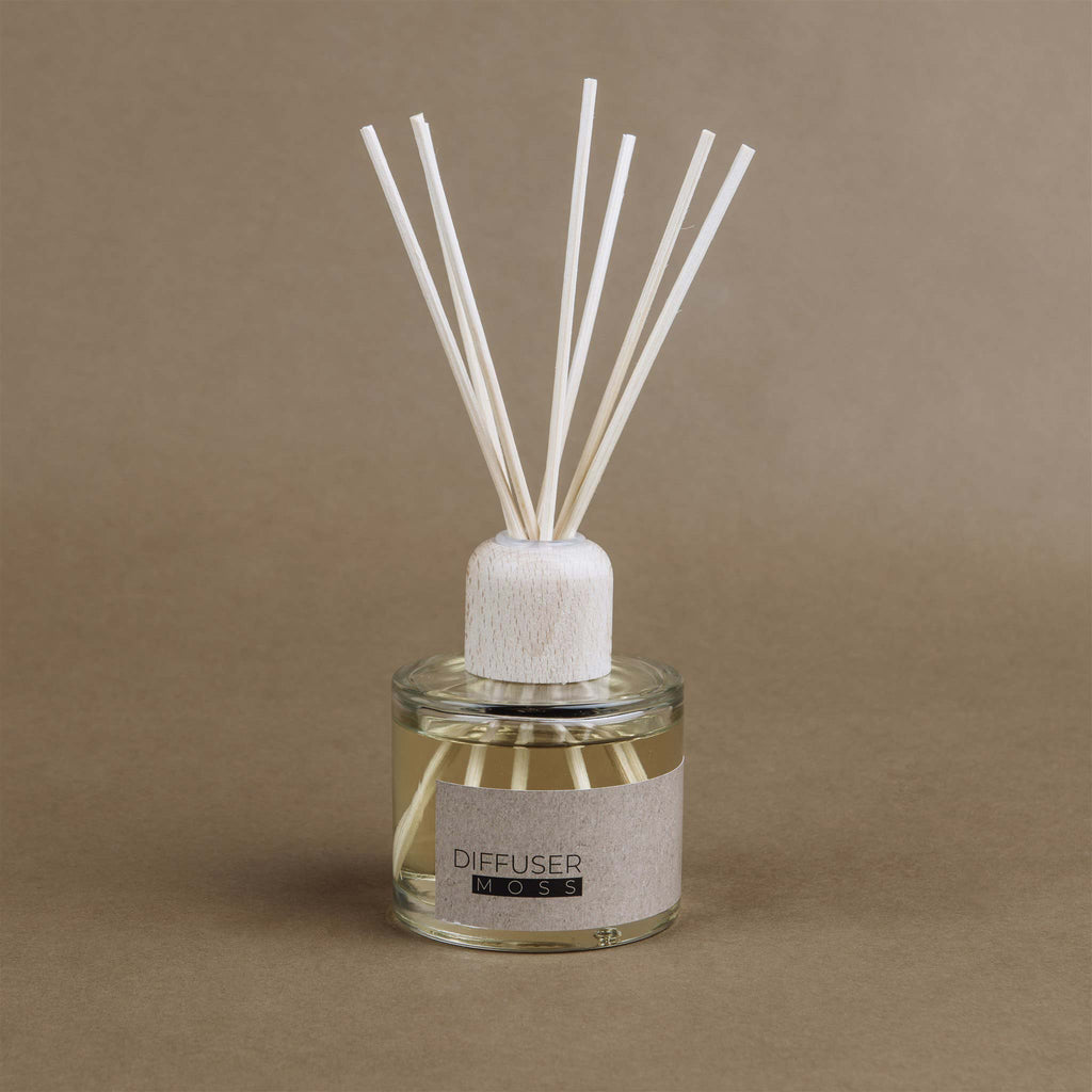 This elegant diffuser features a natural moss fragrance blended with a glycerin-derived diffuser base, poured in a minimalist glass bottle with a wooden lid. Seven natural rattan sticks gently diffuse the uplifting woody aroma into the air, creating a warm, long-lasting atmosphere that feels close to nature.