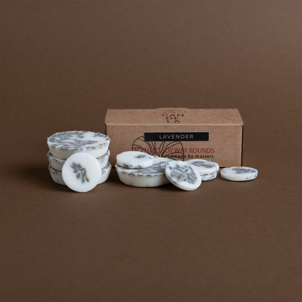 Handcrafted from a sustainable blend of soy and rapeseed wax, these scented wax rounds are infused with natural lavender fragrance and decorated with lavender flowers. Perfect for scenting drawers, closets, or small spaces, they can also be used in wax warmers for a more intensive aromatic experience.
