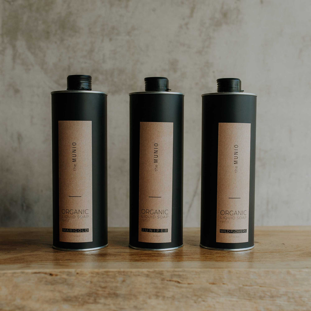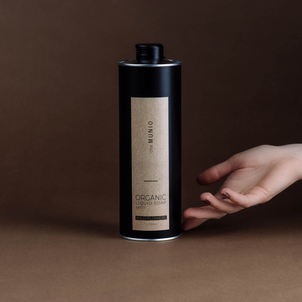 Gently foaming liquid soap made from organic coconut and sunflower oils. Hand poured in metal bottle and fragranced with natural wild flowers fragrance. Refill the MUNIO liquid soap 200ml glass bottle 5 times.